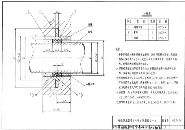 穿線密閉套管說明:1、當迎水面為腐蝕性介質(zhì)時,可采用封堵材料將縫隙封堵;2.套管穿墻處如遇非混凝土墻壁時,應(yīng)局部改用混凝土墻壁,其澆注范圍應(yīng)比翼環(huán)直徑(DS)大200,并且必須將套管一次澆固…